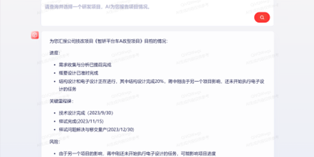 项目管理是研发流程的核心枢纽,关乎产品创新的成败。研发项目的运行需要严密的监控。智石开PLM的“PM小秘”宛如一位贴心的智能助手,主动采集项目关键数据,运用大模型强大的生成能力,自动绘制可视化图表,生成详尽的项目阶段报告,并精准进行问题分析与风险预警。项目经理借此可实时掌控项目动态,提前化解潜在危机,确保项目稳步推进。